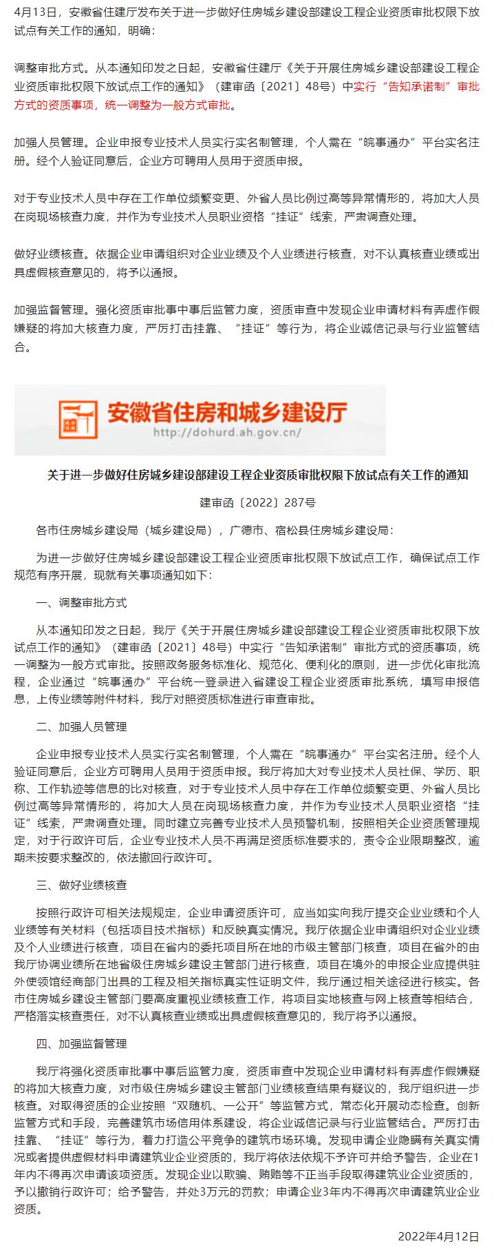 安徽:嚴(yán)厲打擊掛靠、“掛證”!下放資質(zhì)由“告知承諾制”調(diào)整為一般方式審批
