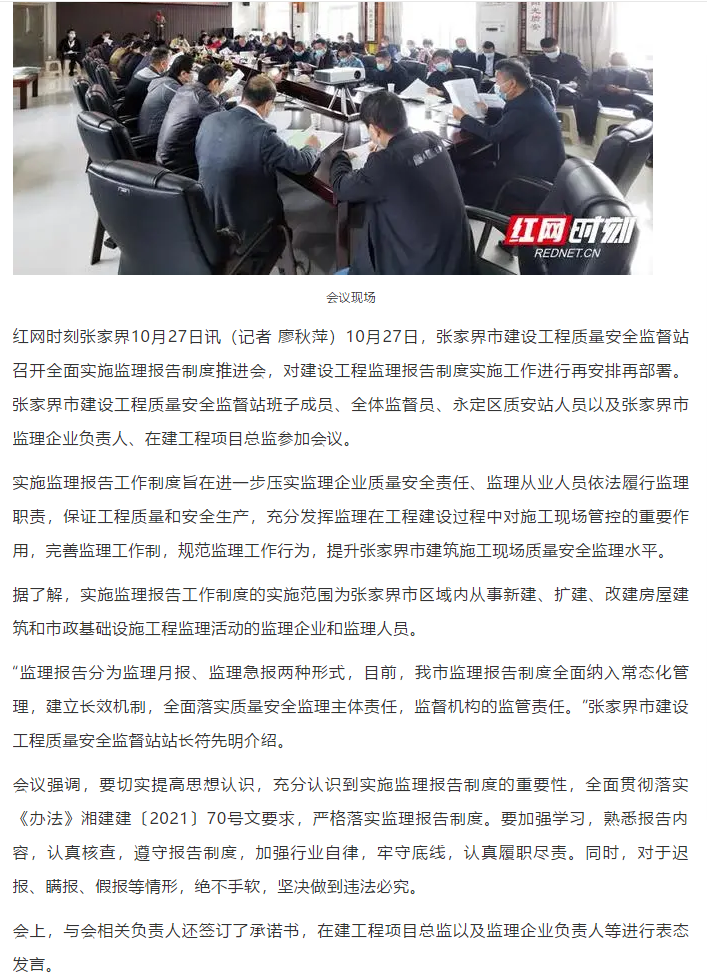張家界市:扎實推進建設(shè)工程監(jiān)理報告制度,全面落實質(zhì)量安全監(jiān)理主體責(zé)任,監(jiān)督機構(gòu)的監(jiān)管責(zé)任