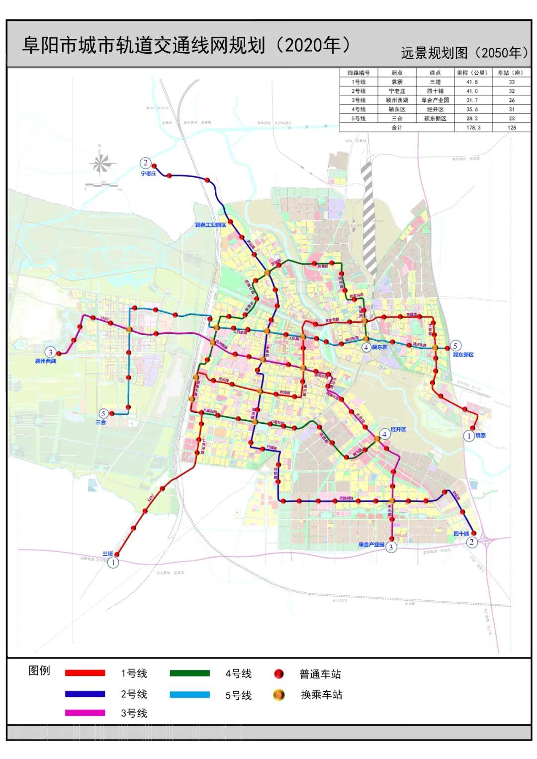軌道線網(wǎng)規(guī)劃遠(yuǎn)景由5條線路組成,線網(wǎng)總長度178.3公里,總站點數(shù)128座,其中,換乘站17座。