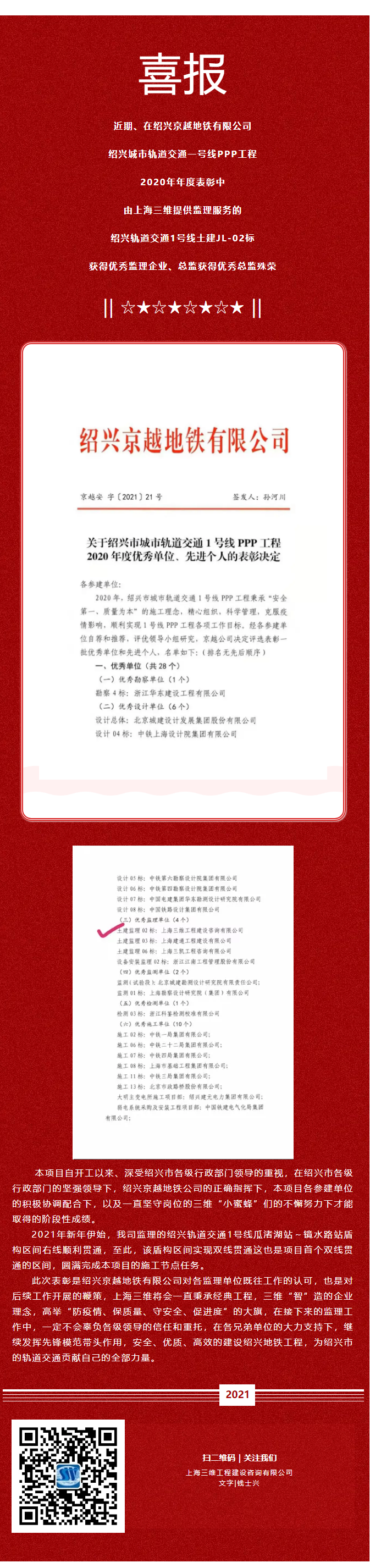 喜報!我司榮獲2020年度紹興軌道交通一號線年度表彰優(yōu)秀監(jiān)理單位