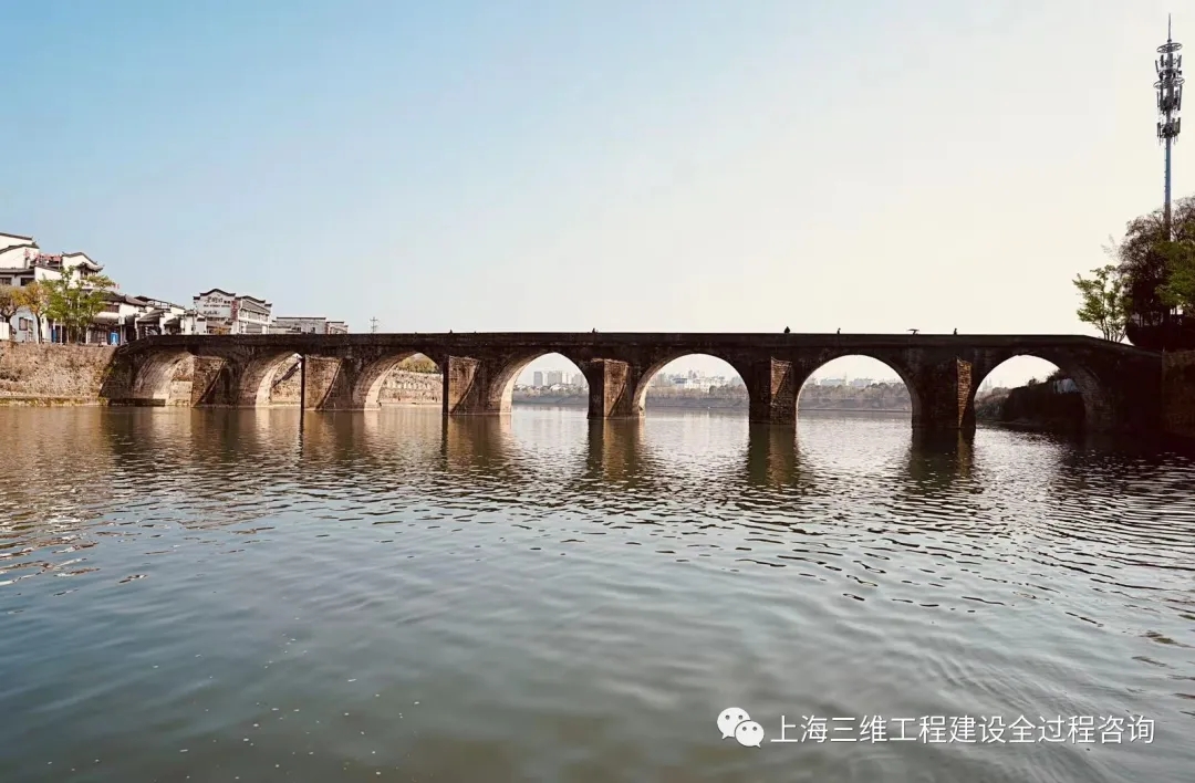 鎮(zhèn)海橋修繕工程主要為文物本體修復(fù)及兩側(cè)駁岸修復(fù)加固,橋梁長(zhǎng)度131.2米,橋面寬7.53米