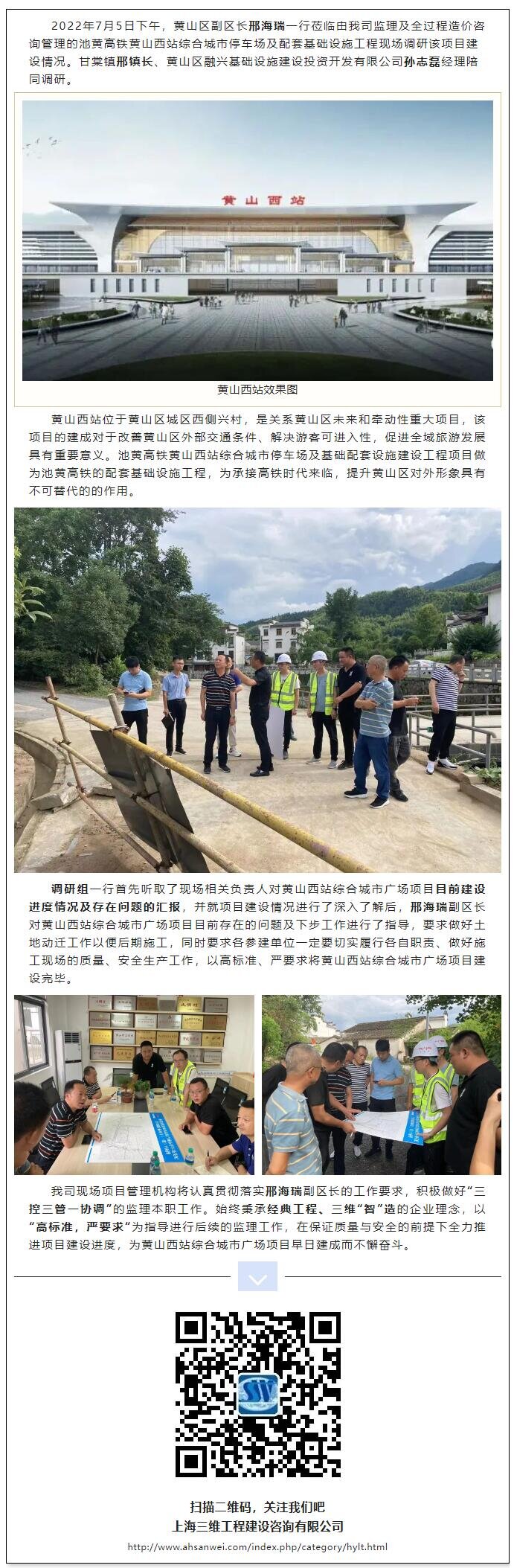 黃山區(qū)副區(qū)長邢海瑞一行調研我司監(jiān)理及全過程造價咨詢管理的池黃高鐵黃山西站綜合城市廣場項目