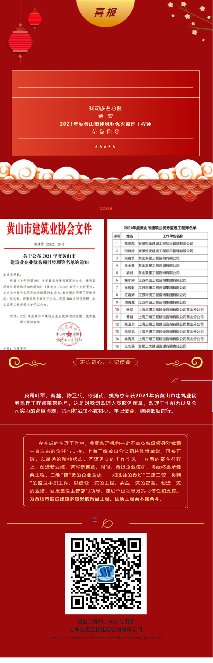 喜 報 | 我司多名總監(jiān)榮獲2021年度黃山市建筑業(yè)優(yōu)秀監(jiān)理工程師榮譽(yù)稱號