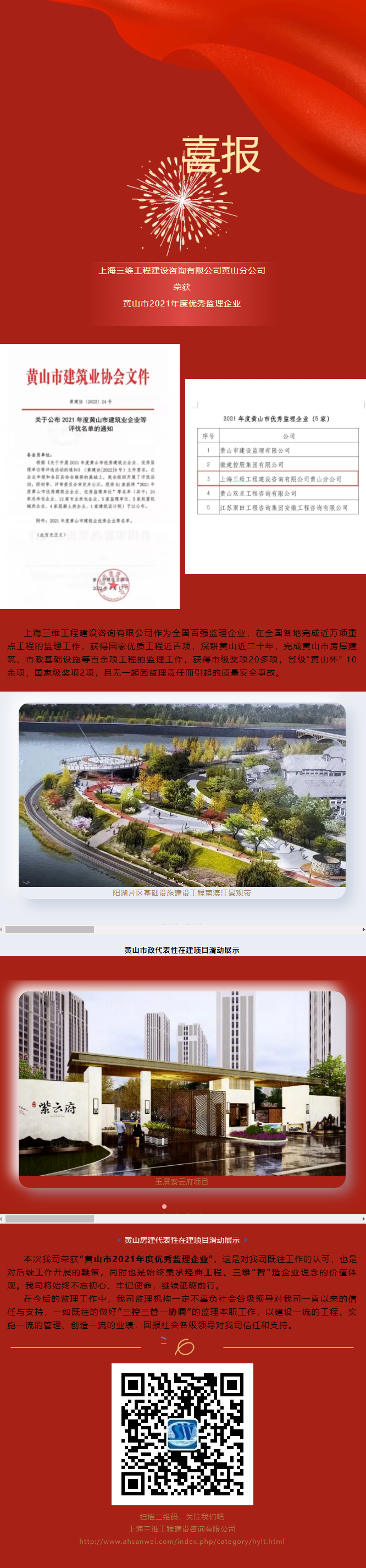 喜 報 | 我司榮獲黃山市2021年度優(yōu)秀監(jiān)理企業(yè)